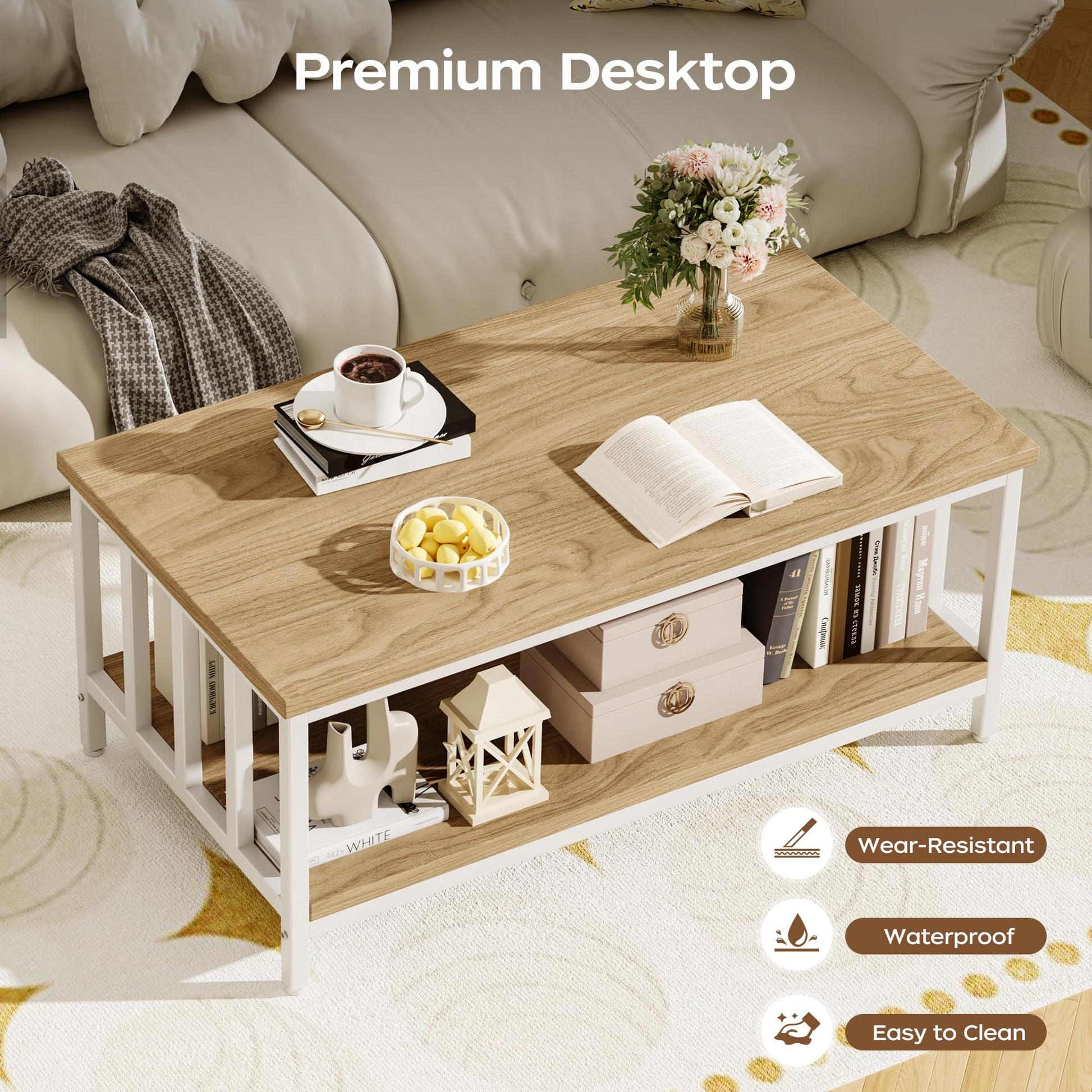 Modern Farmhouse Coffee Table with Slatted Frame, 2-Tier Storage Shelf for Living Room or Office, 39 Inch Light Coffee