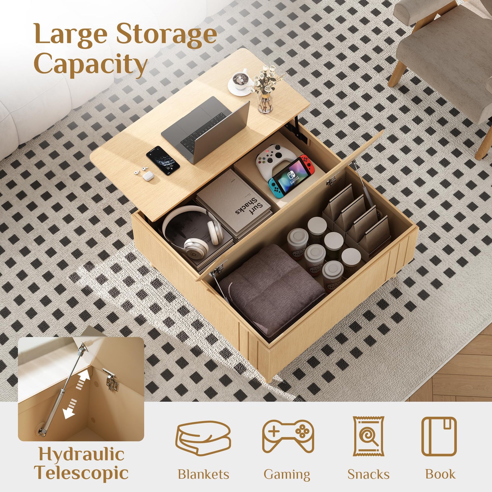 - Lift Top Design Combined with Versatility: The lift top coffee table adopts a stable lifting design and versatility,providing a convenient space for dining,gaming or using a laptop.It is a must-have choice for those who pay attention to the versatility of furniture