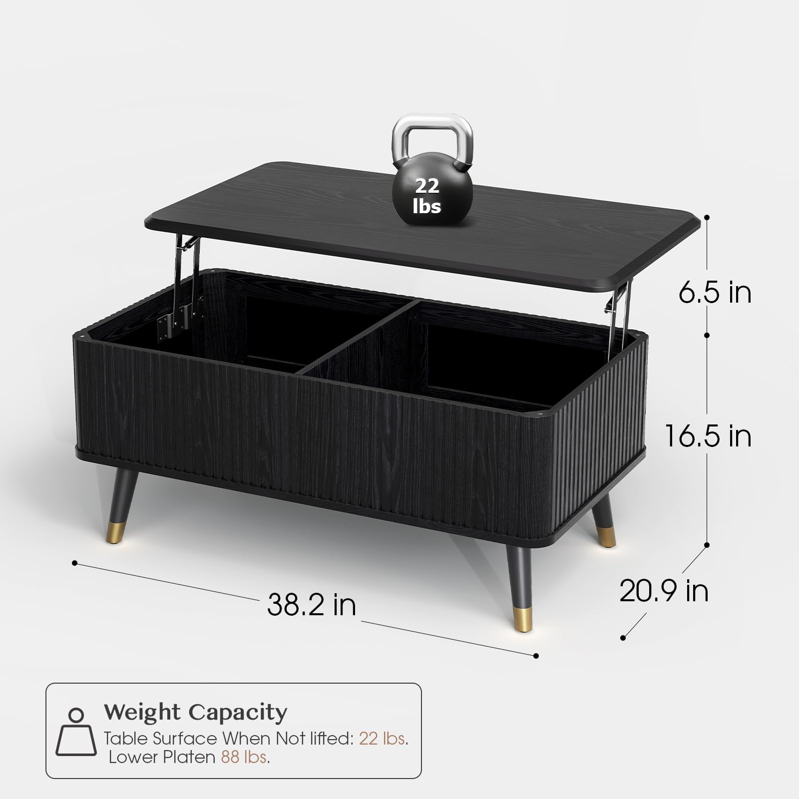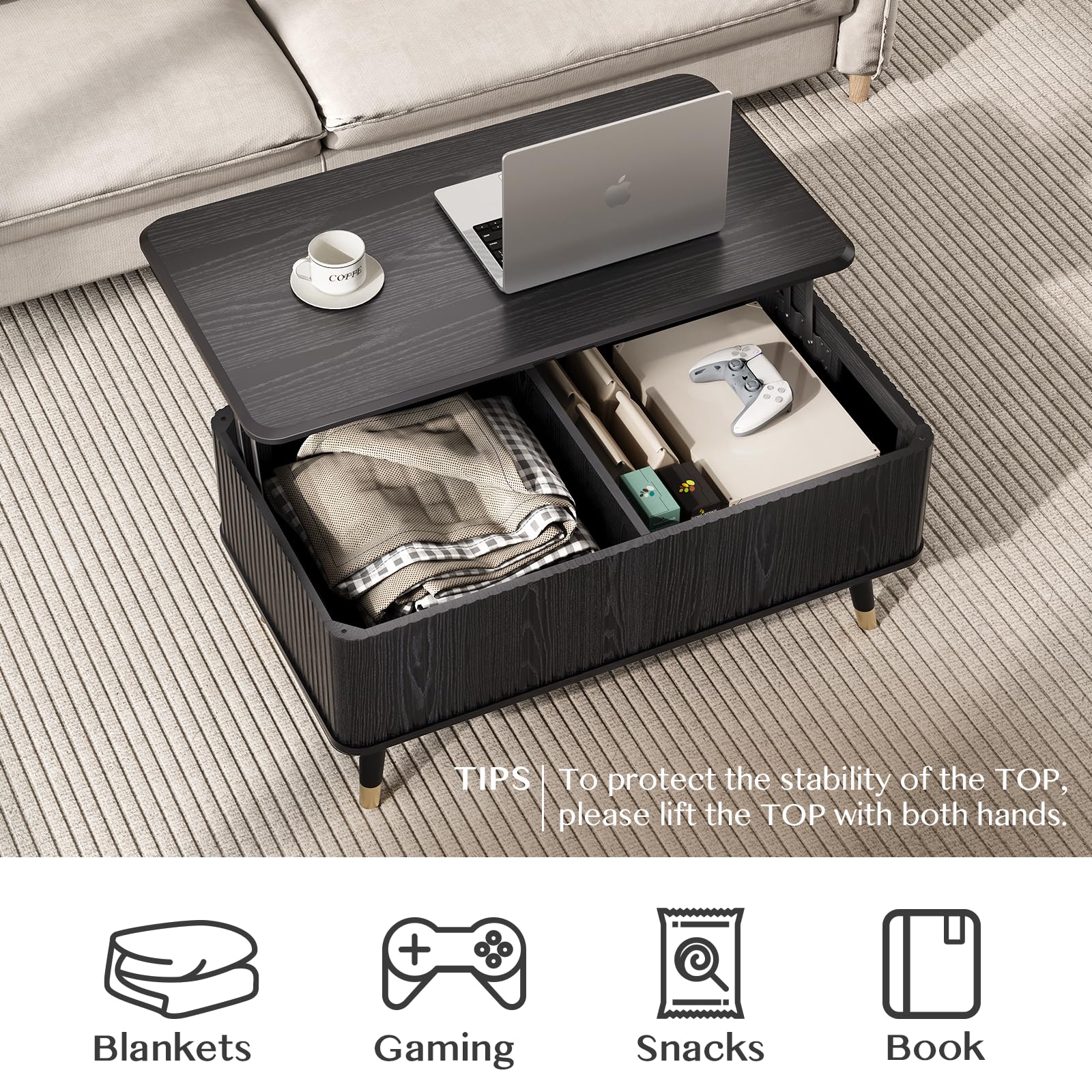 - Plenty of Storage Space : Our black coffee tables for living room features a pull-up tabletop design. When raised, it reveals a spacious hidden compartment and storage area underneath, perfect for storing books, water cups, game consoles, laptops, remote controls, and more, keeping the tabletop always neat and tidy