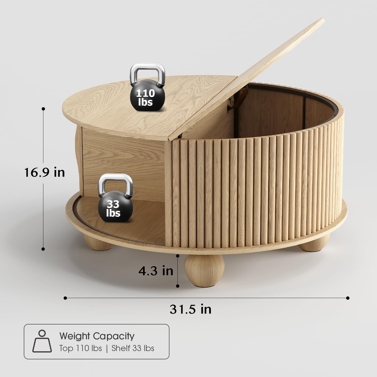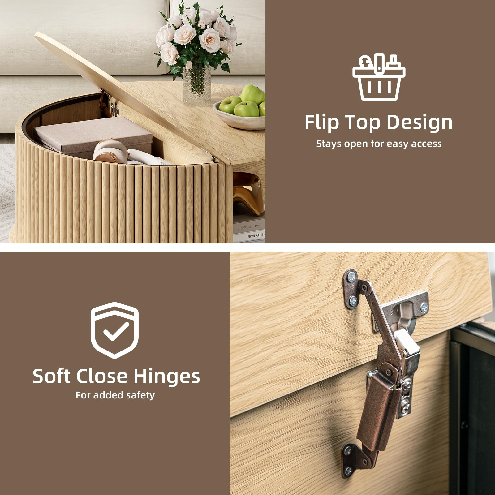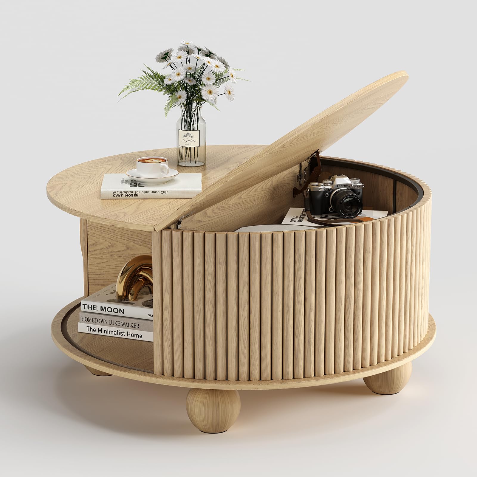 Round Coffee Table with Storage, 31.5" Fluted Lift-Top Drum Center Table with Sliding Door and Bun Feet, Mid-Century Modern Coffee Table for Living Room or Small Spaces, Oak