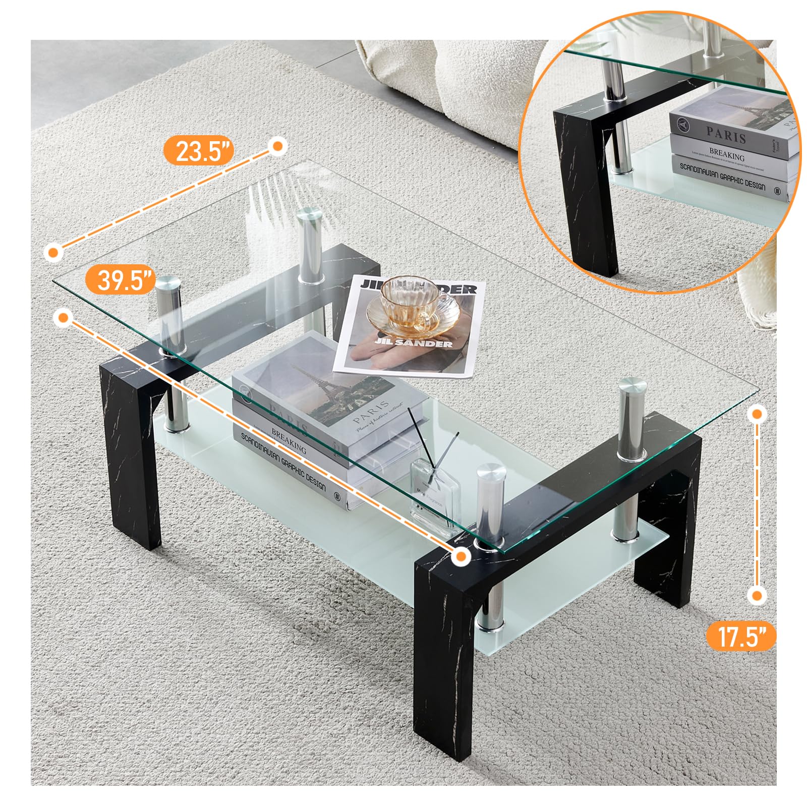 Modern Rectangle Coffee Table for Living Room, Black Marble Glass Tea Table with Wooden Legs & Lower Storage Shelf, Stylish Center Table for Home, Office, or Waiting Room