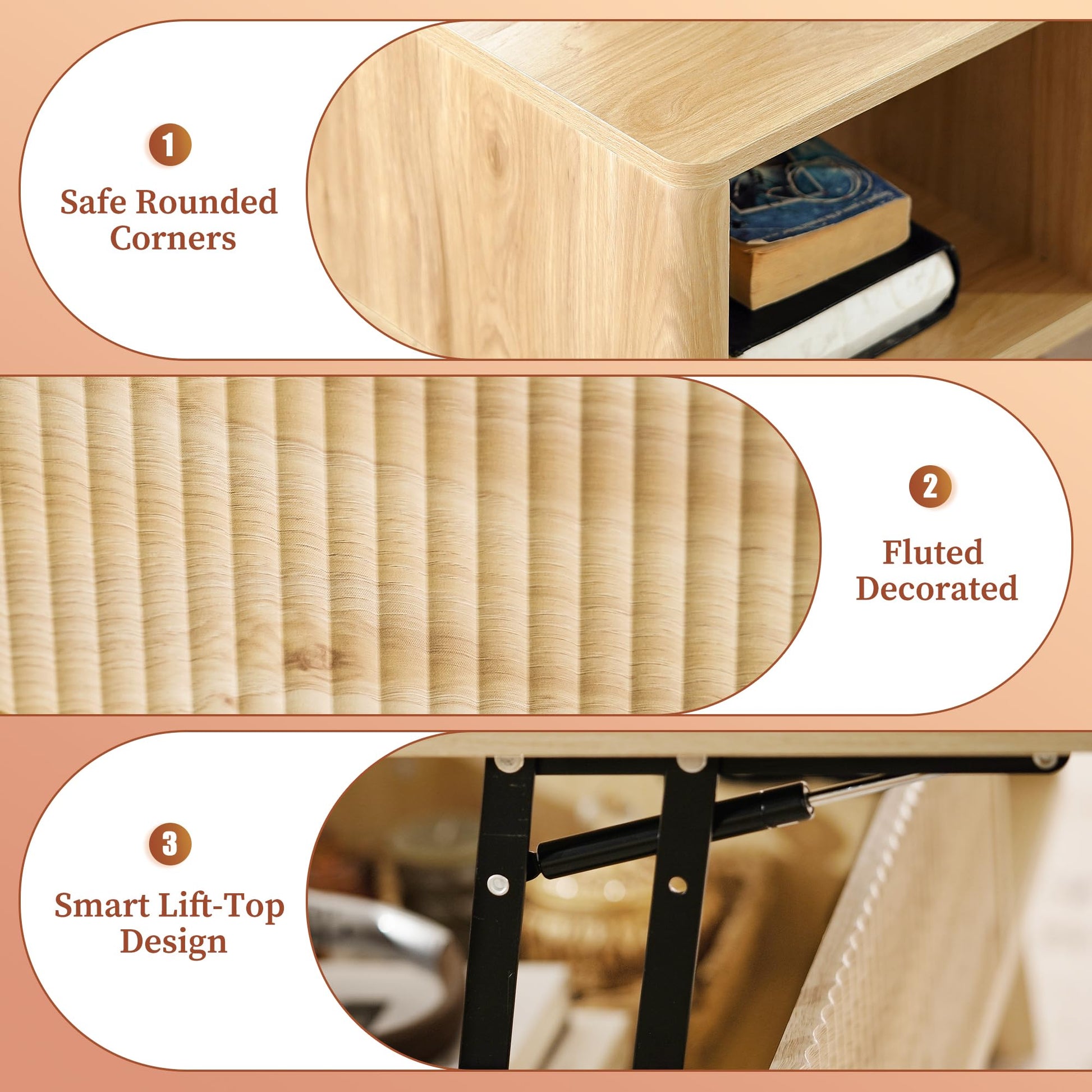 Details: Fluted Coffee Table with Hidden Compartment, Wood Lift Top Coffee Tables, Modern Center Table for Living Room, Home Office