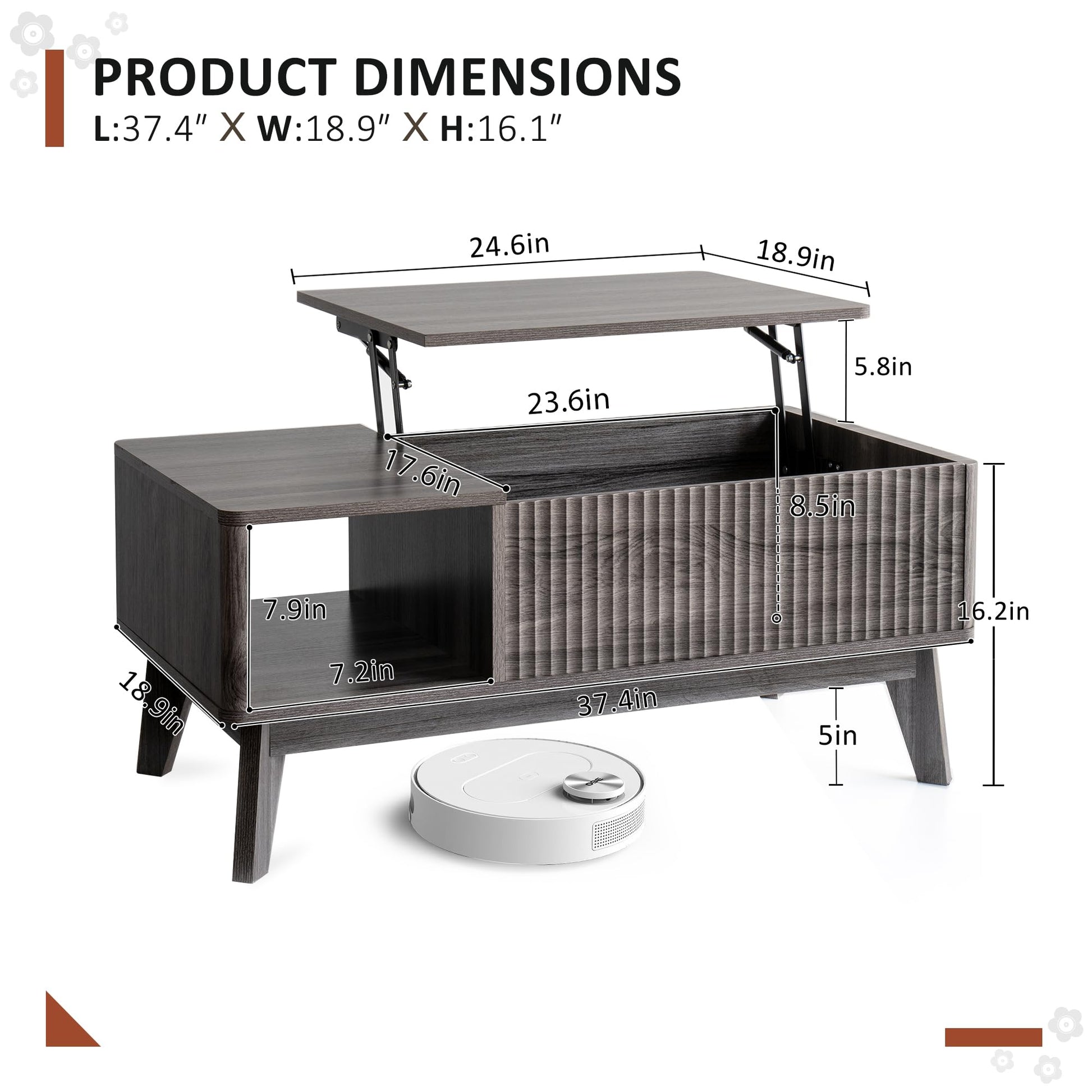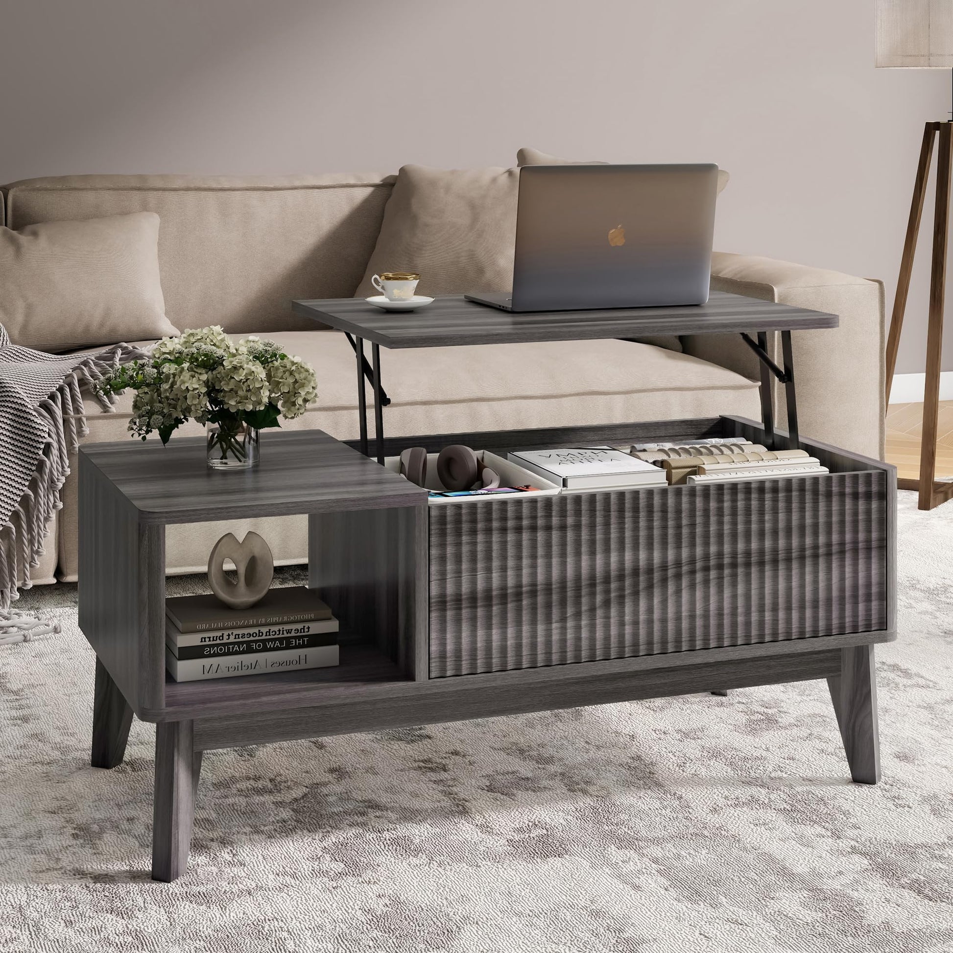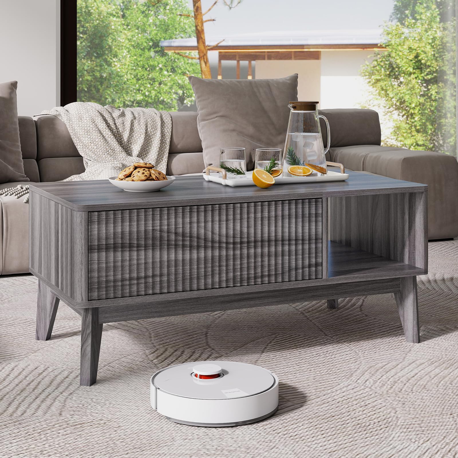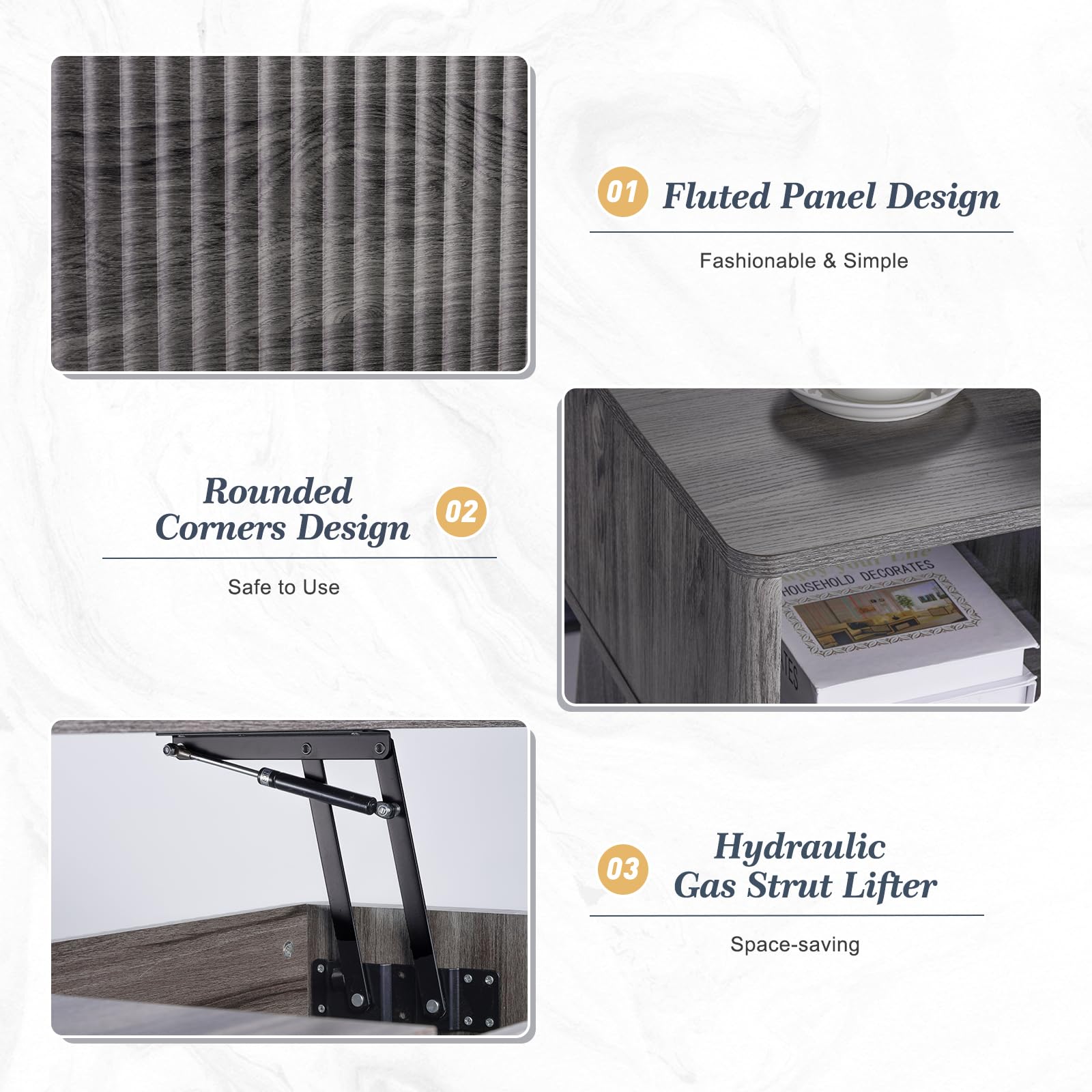 LYNCOHOME Fluted Lift Top Coffee Table with Storage – Modern Center Table for Living Room or Home Office, Grey Finish