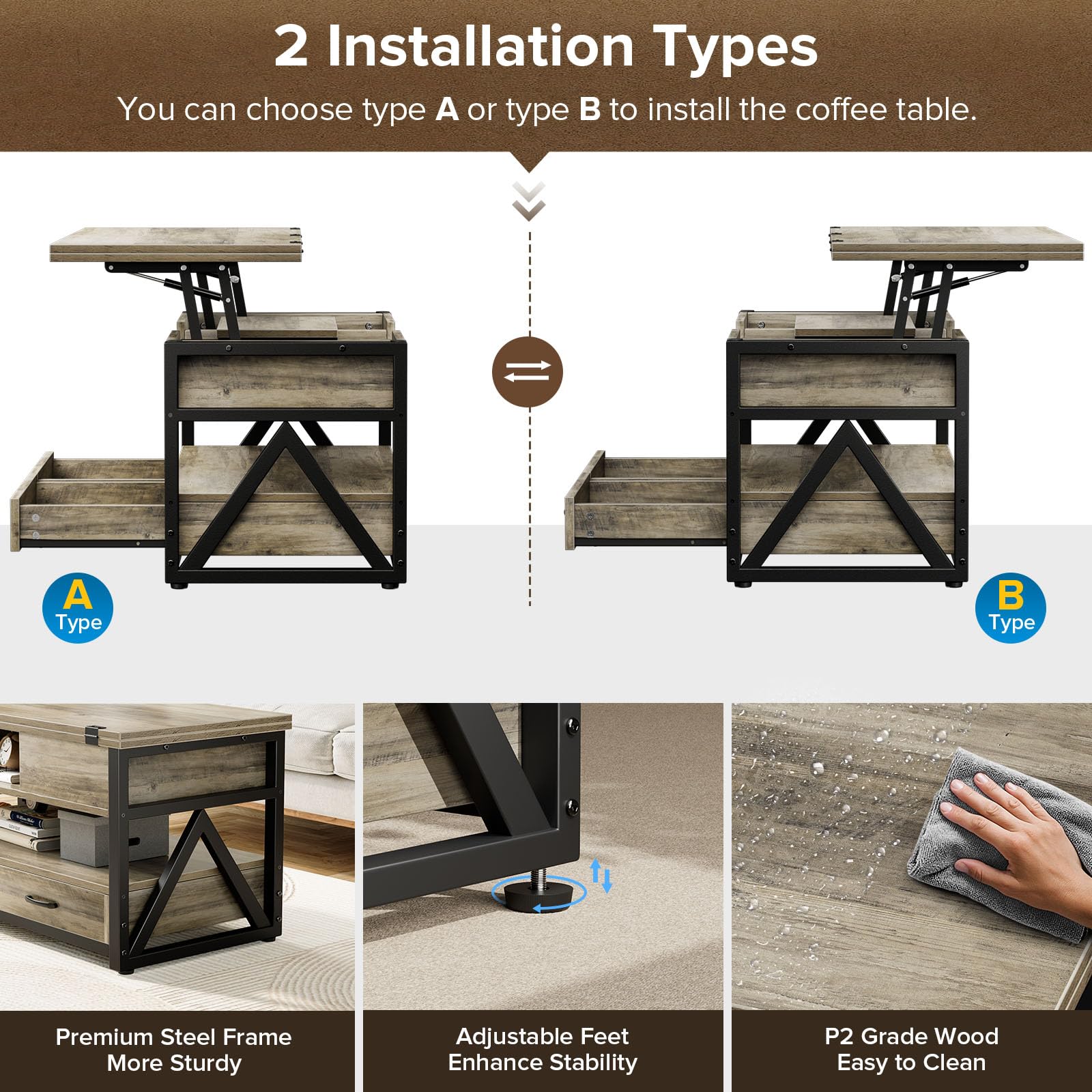 - 【4-in-1 Lift Top Design】Unique lift top coffee table design to meet more needs:when fully unfolded,it becomes a dining or gaming lift coffee table for 4-8 people;when half expanded,it becomes a workstation for 2 people to use at the same time without disturbing each other; when lifting top is closed, rustic coffee table is suitable for storing sundries.