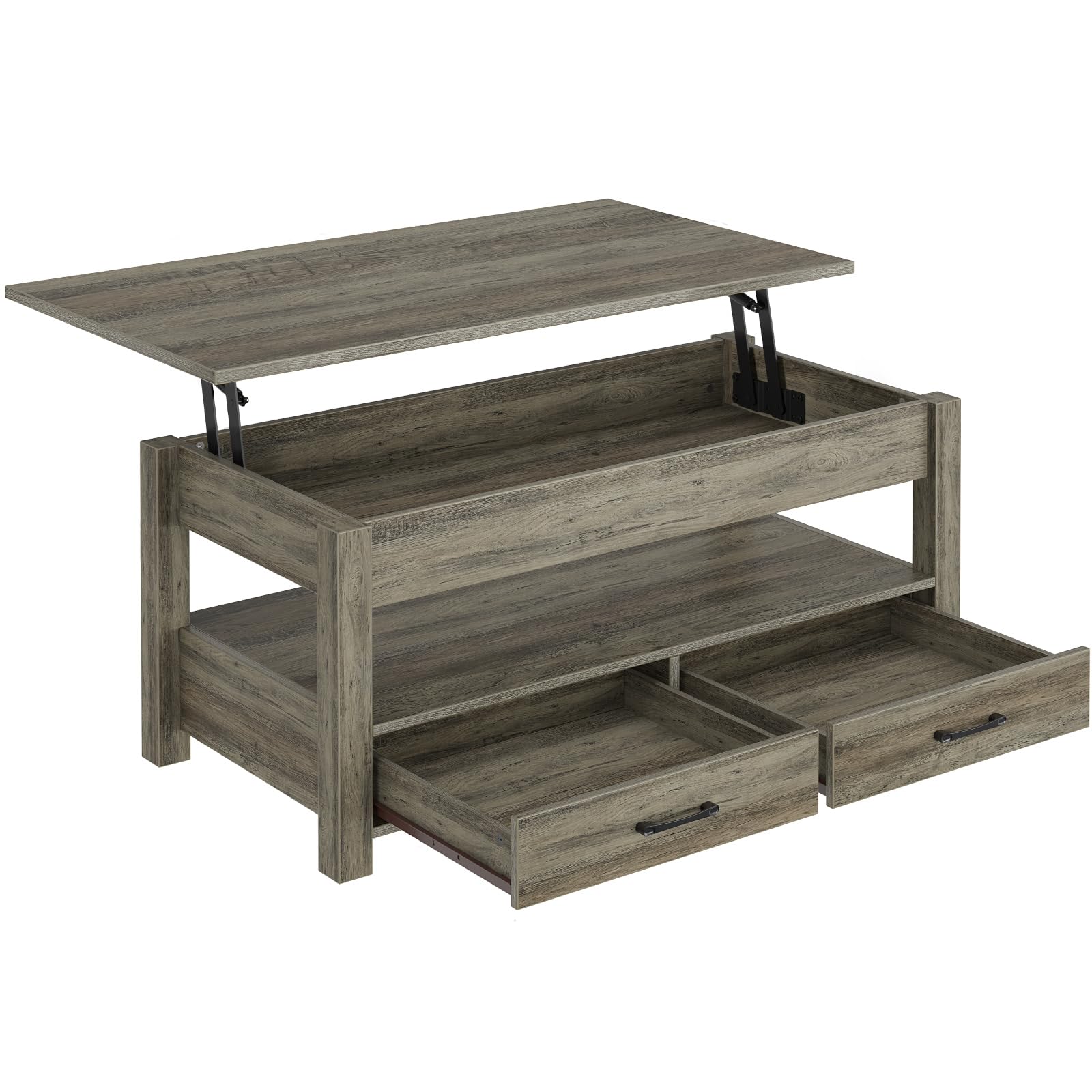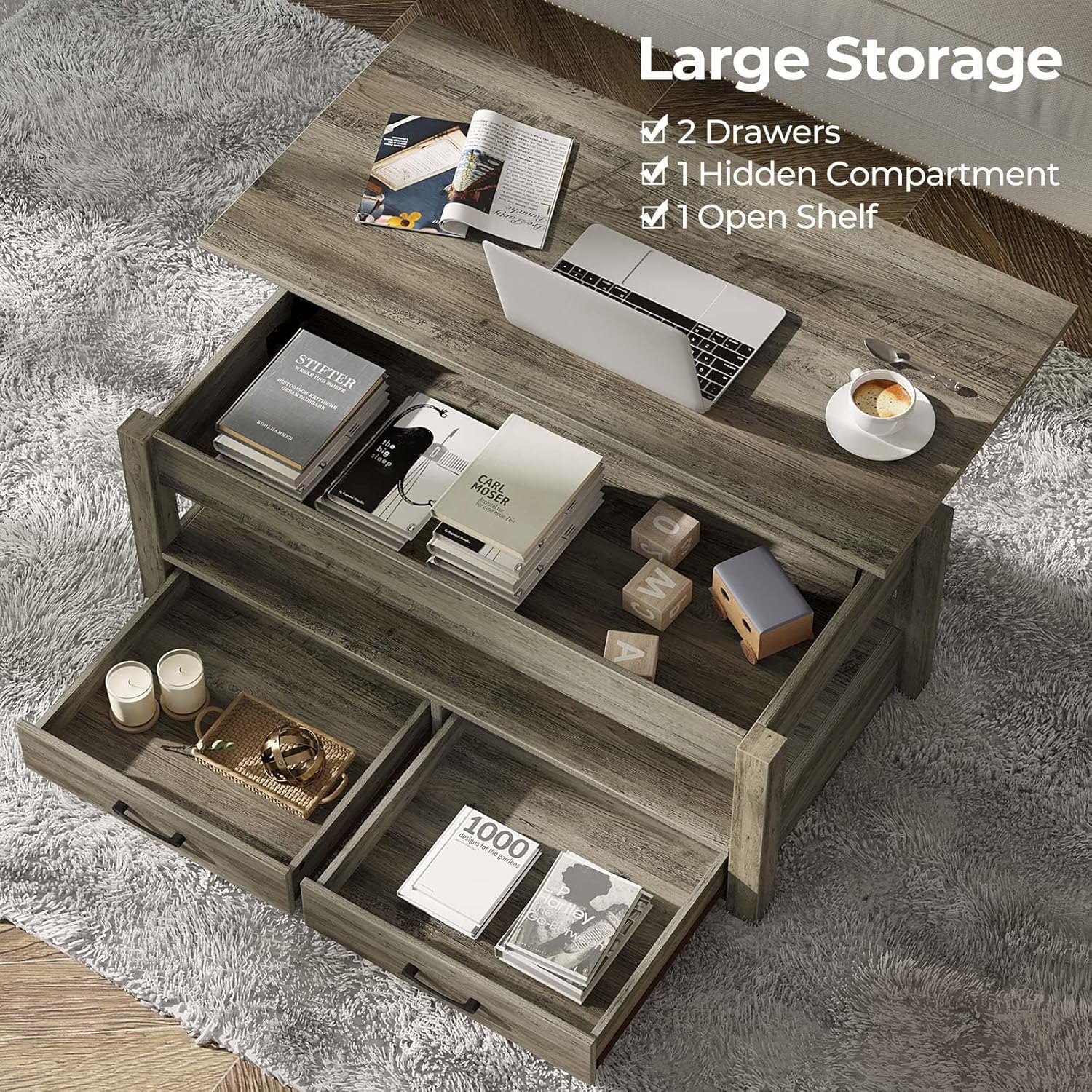 Rolanstar 47.2" Lift Top Coffee Table with Drawers & Hidden Compartment – Retro Wooden Central Table with Adjustable Lift Tabletop for Living Room, Washed Oak