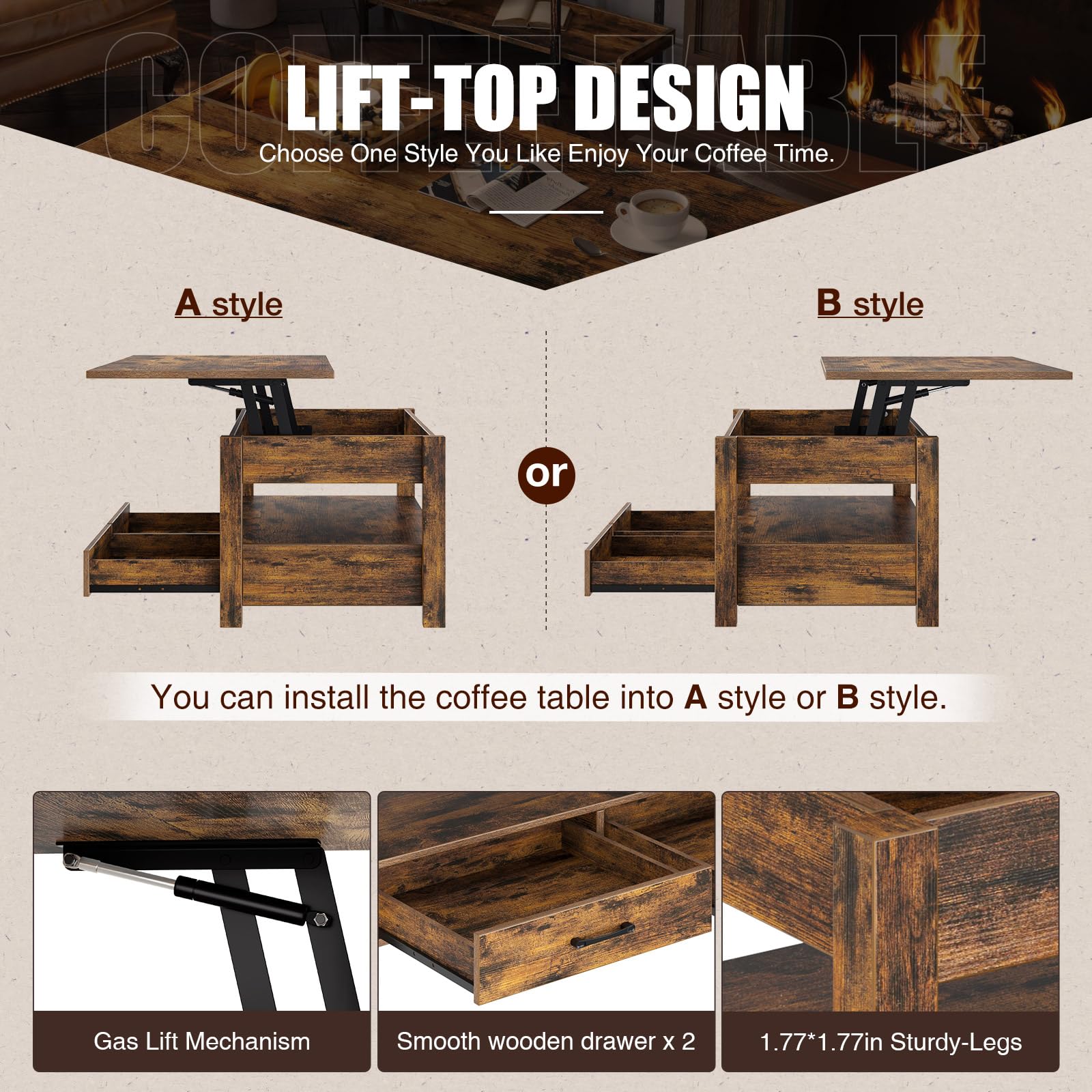 Rolanstar Lift Top Coffee Table with Drawers & Hidden Compartment – Retro Wooden Central Table with Adjustable Lift Tabletop for Living Room, Rustic Brown