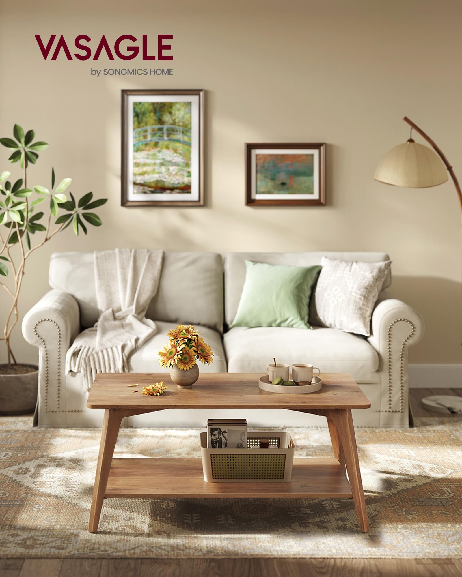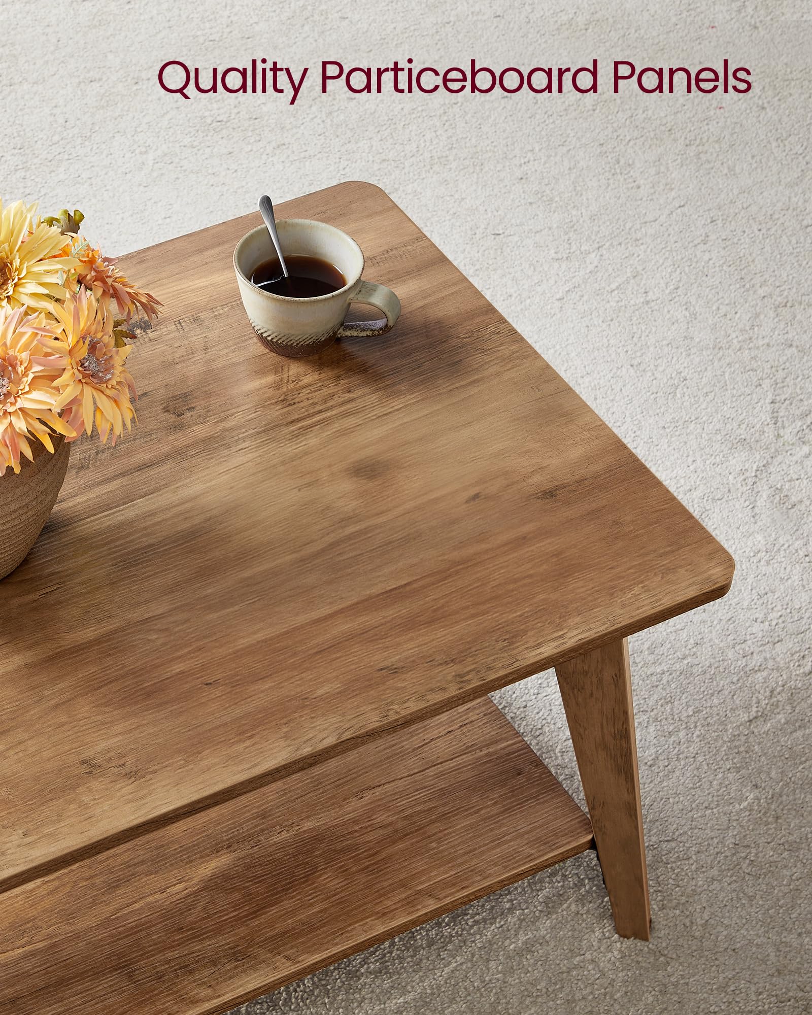 VASAGLE MAEZO Collection 2-Tier Coffee Table with Storage, Tapered Legs & Curved Transitions – 21.7" x 39.4" x 17.7" Modern Center Table for Living Room, Easy Assembly, Honey Brown (ULCT249K01)