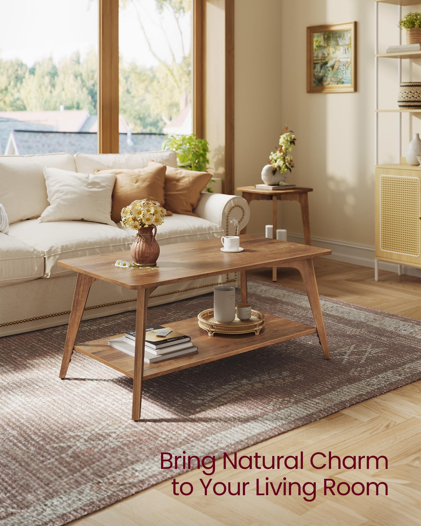 - 2-Tier Storage: Measuring 21.7"D x 39.4"W x 17.7"H, this 2-tier coffee table offers ample space with a tabletop for vases and a lower shelf for books or magazines, keeping your daily items organized and within easy reach.